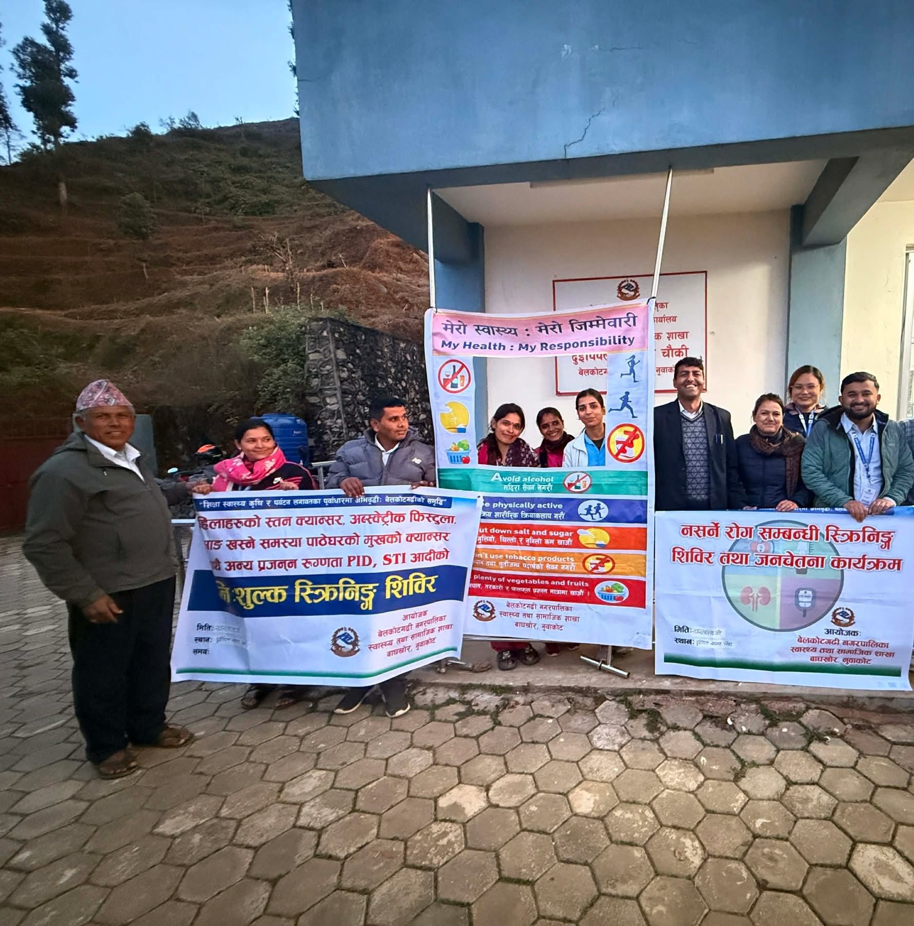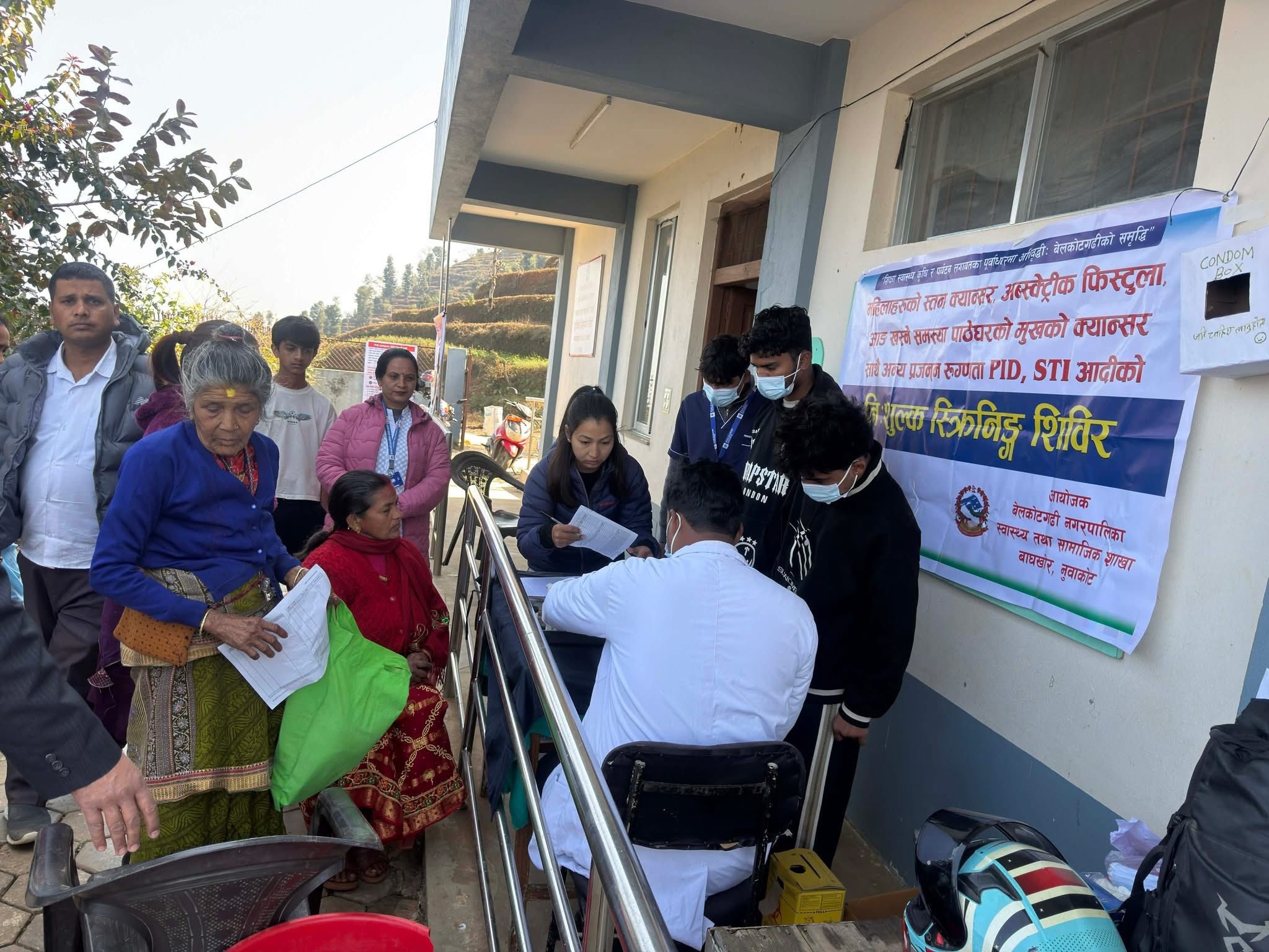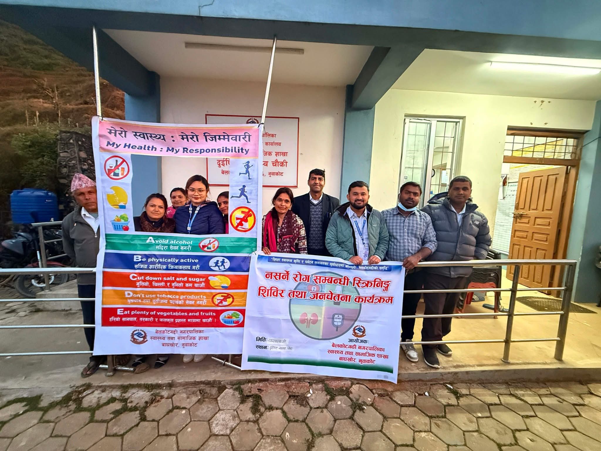 बेलकोटगढी नगरपालिका स्वास्थ्य तथा सामाजिक शाखाको आयोजनामा सन्चालित कार्यक्रमले समुदायमा नसर्ने रोगको समयमै पहिचान र रोकथाममा महत्वपूर्ण सहयोग पु¥याउने विश्वासका साथ बेलकोटगढी नपा ६ स्थित दुईपिपल स्वास्थ्य चौकीमा ३० वर्षभन्दा माथि उमेर समूहका महिलाहरूलाई लक्ष्यित गर्दै सोमवार नसर्ने रोग सम्बन्धि स्क्रिनिंग तथा महिला स्वास्थ्य शिविर सम्पन्न भएको छ । शिविरमा रक्तचाप मापन, मधुमेह परीक्षण, मिर्गौला रोग स्क्रिनिंग, तौल–उचाइका आधारमा विएमआई मापन, नसर्ने रोगका जोखिम तत्व (सुर्तीजन्य पदार्थ, मदिरा, अस्वस्थ्य खानपान, शारीरिक निष्क्रियता) नियन्त्रण र रोकथाम सम्बन्धि परामर्श सेवा प्रदान गरिएको थियो ।