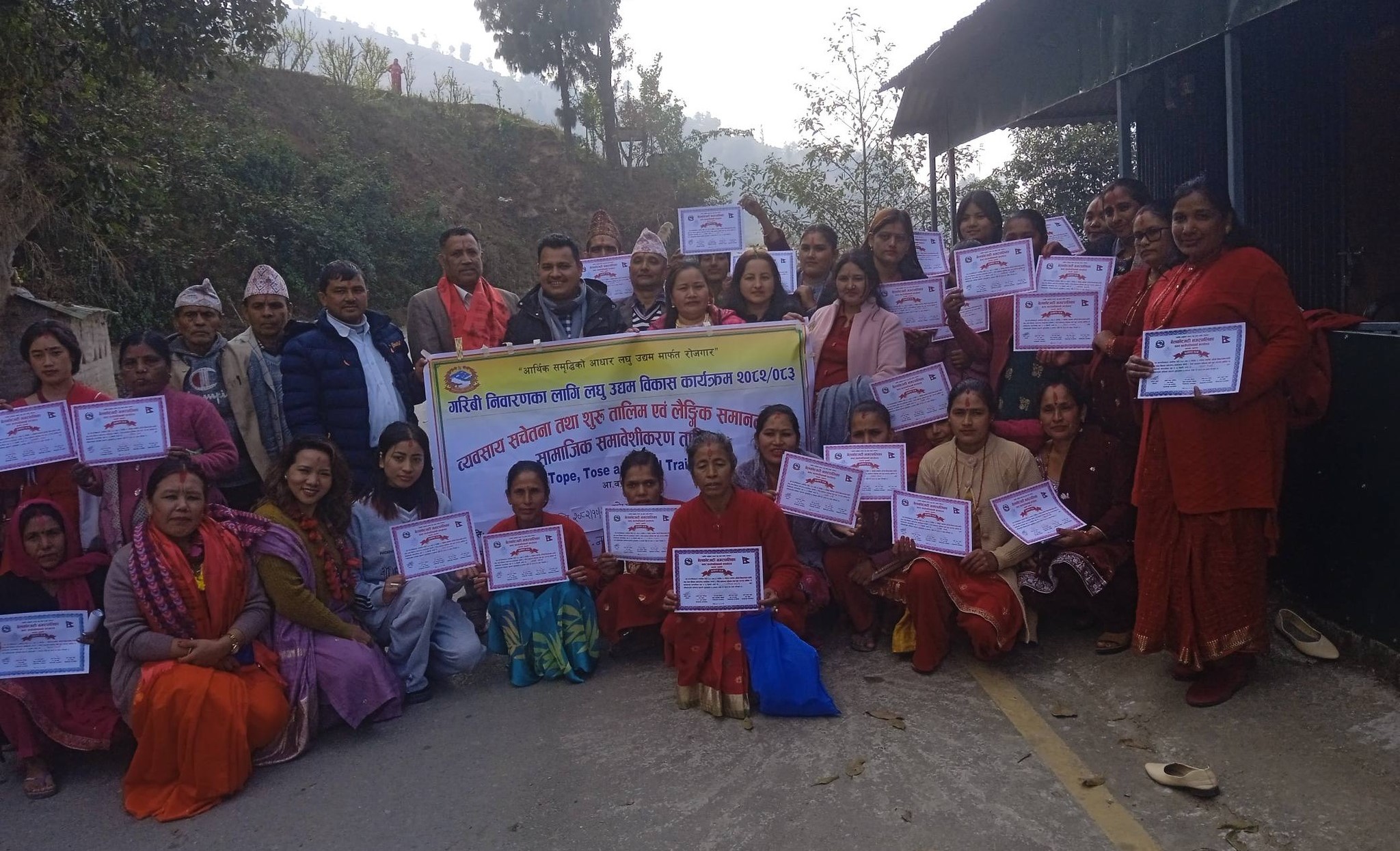 वेलकोटगढी नगरपालिकाद्वारा सन्चालित लघु उद्यम विकास कार्यक्रम अन्तर्गत सञ्चालित आठ दिने एको लैङ्गिक समानता र सामाजिक समावेशीकरण तालिम सम्पन्न भएको हो । उक्त तालिमको बेलकोटगढी नपाका उपमेयर शिवप्रसाद दाहालले समापन गरे ।