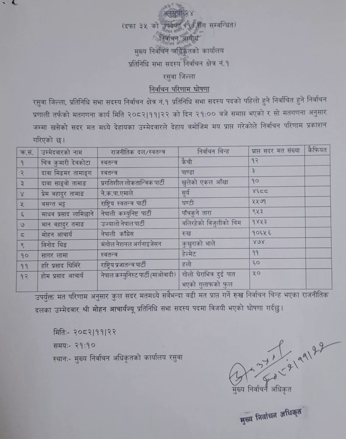 बिदुरः नुवाकोटसंगै जोडिएको छिमेकी रसुवामा नेपाली कांग्रेसका मोहन आचार्य भारी मतका साथ विजयी भएका छन् । उनले रसुवामा लगातार हयाट्रिक विजय पाएका हुन् । प्रतिनिधिसभा सदस्य निर्वाचनअन्तर्गत रसुवामा नेपाली काँग्रेसका ई. मोहन आचार्य विजयी भएका हुन् ।