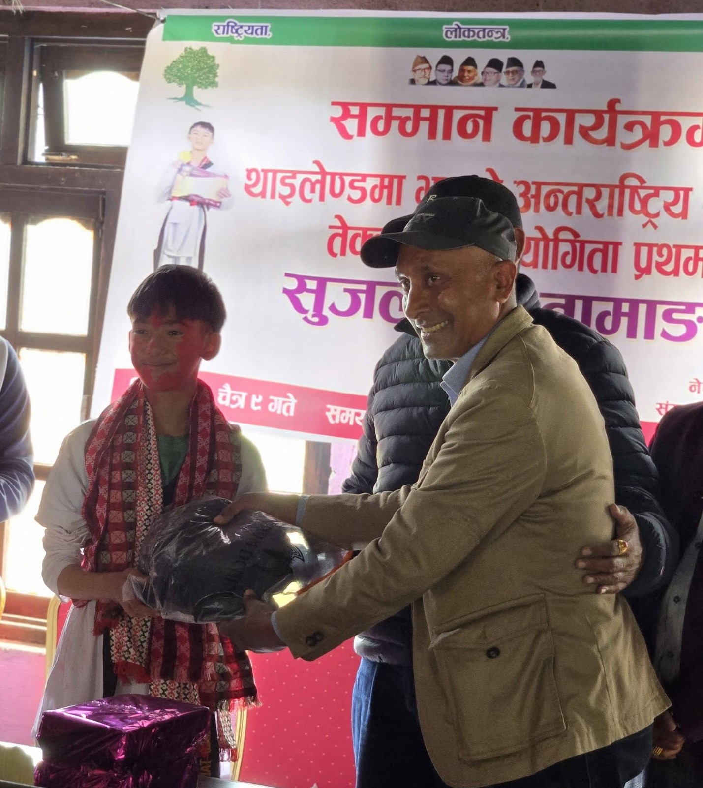 उनलाई प्रोत्साहनस्वरुप खेलकुद पोशाकलगायतका सामग्रीसमेत प्रदान गरिएको छ । सम्मानित गर्दै कांग्रेस नुवाकोटका उपसभापति राजु थापा, सचिव श्रीराम श्रेष्ठलगायतले खेलकुदको माध्यमले नुवाकोट तथा नेपालको गरिमा वढाएको कदर गर्दै खेलाडि सुजल लोतामाङलाई प्रोत्साहनस्वरुप सम्मानित गरिएको वताए ।