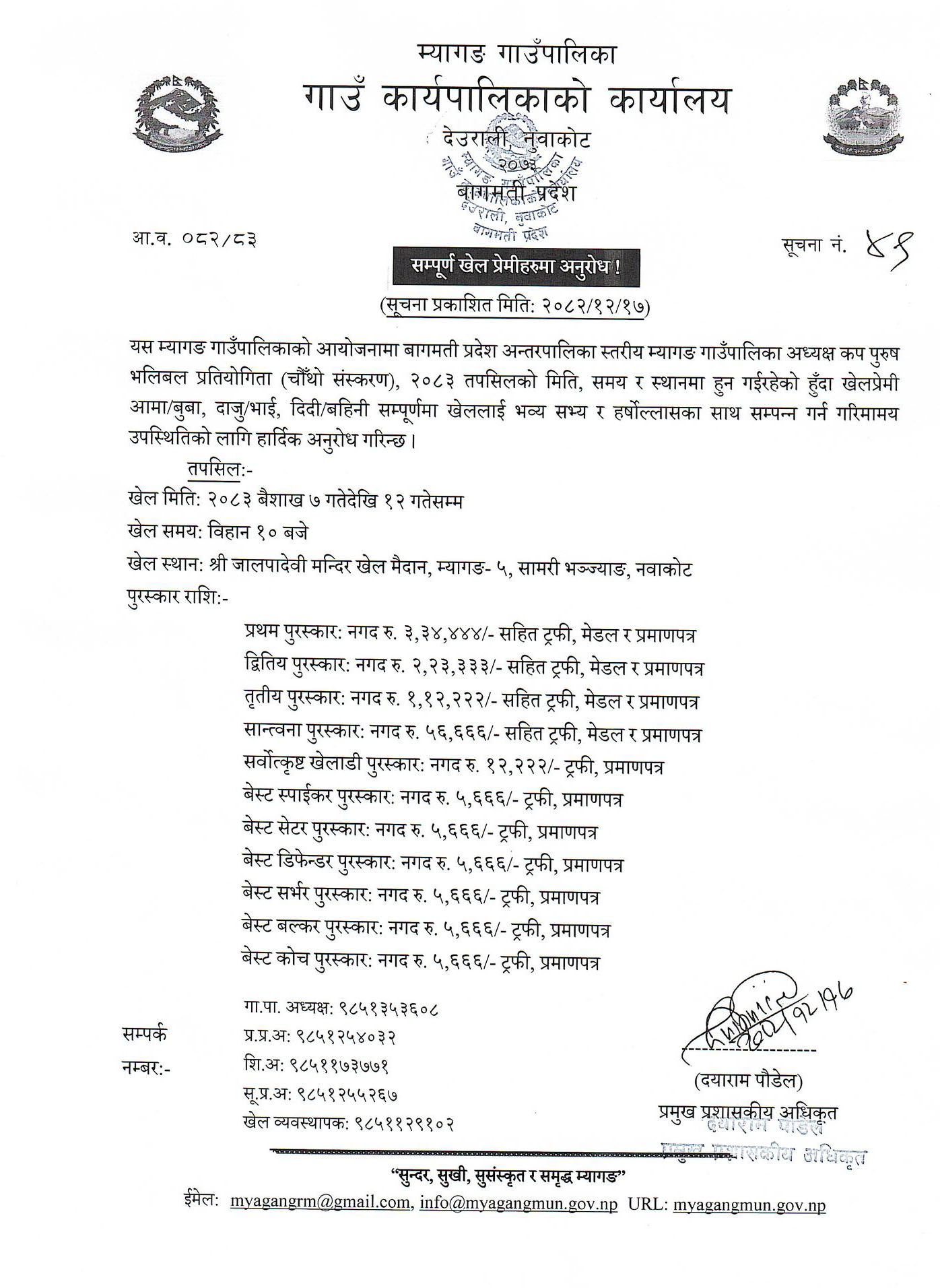 पत्रकार सम्मेलनमा दिइएको जानकारीअनुसार प्रतियोगिता आगामी २०८३ साल वैशाख ७ गतेदेखि १२ गतेसम्म सञ्चालन गरिनेछ । खेल बिहान १० बजेदेखि सुरु हुनेछन् भने स्थानीय जालपादेवी मन्दिर खेल मैदानमा सन्चालन गरिने प्रमुख प्रशासकिय अधिकृत दयाराम पौडेलको भनाई छ । प्रतियोगितामा विजेताले विजेताले नगद तीनलाख ३४ हजार चारसय ४४ तथा उपविजेताले नगद दुईलाख २३ हजार तीसय ३३, तृतीय स्थान जित्नेले नगद एकलाख १२ हजार दुईसय २२, सान्त्वना हुनेले नगद ५६ हजार ६ सय ६६ रुपैया नगदसहित ट्रफी, मेडल र प्रमाणपत्र पुरस्कार पाउनेछन् ।