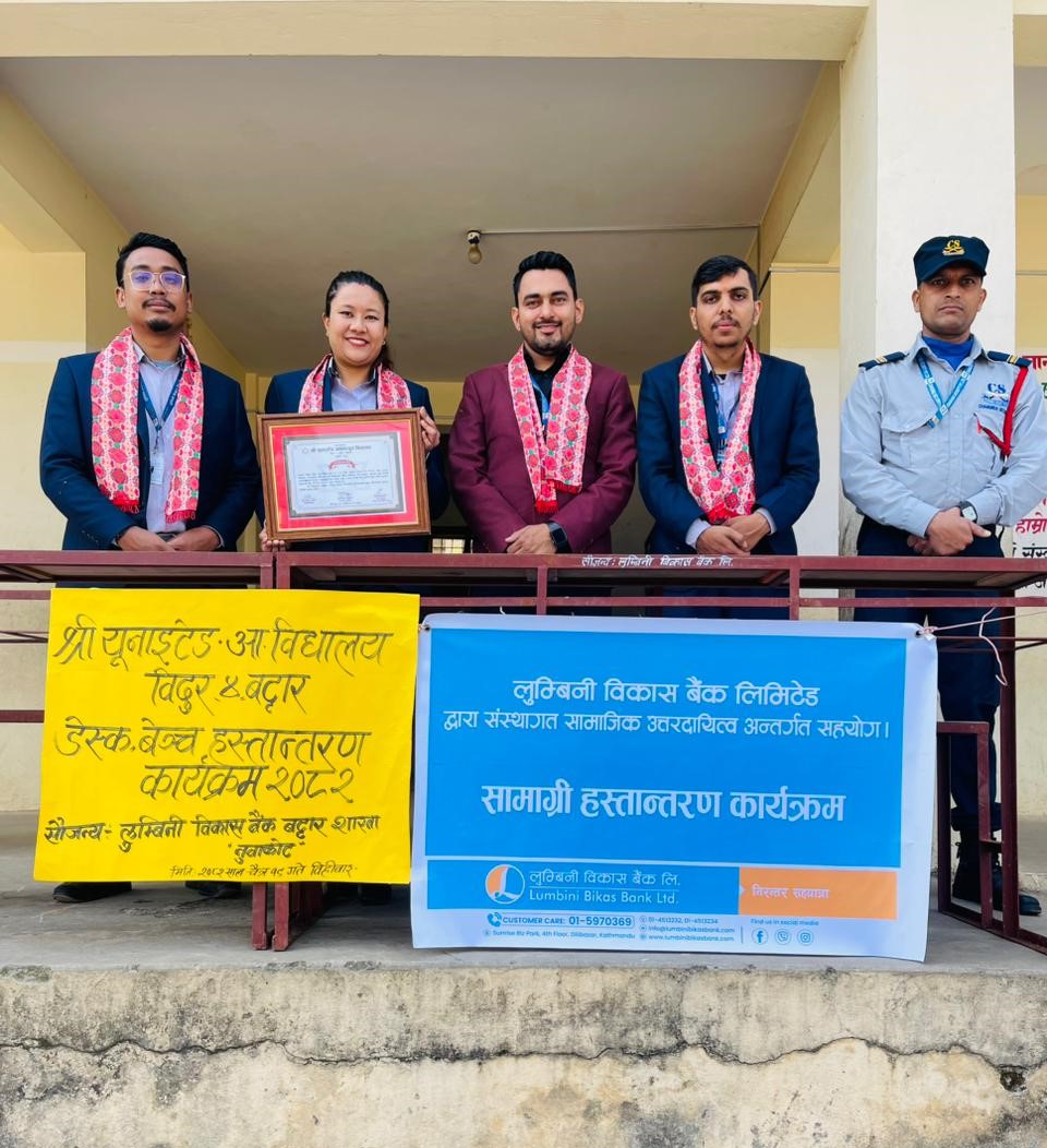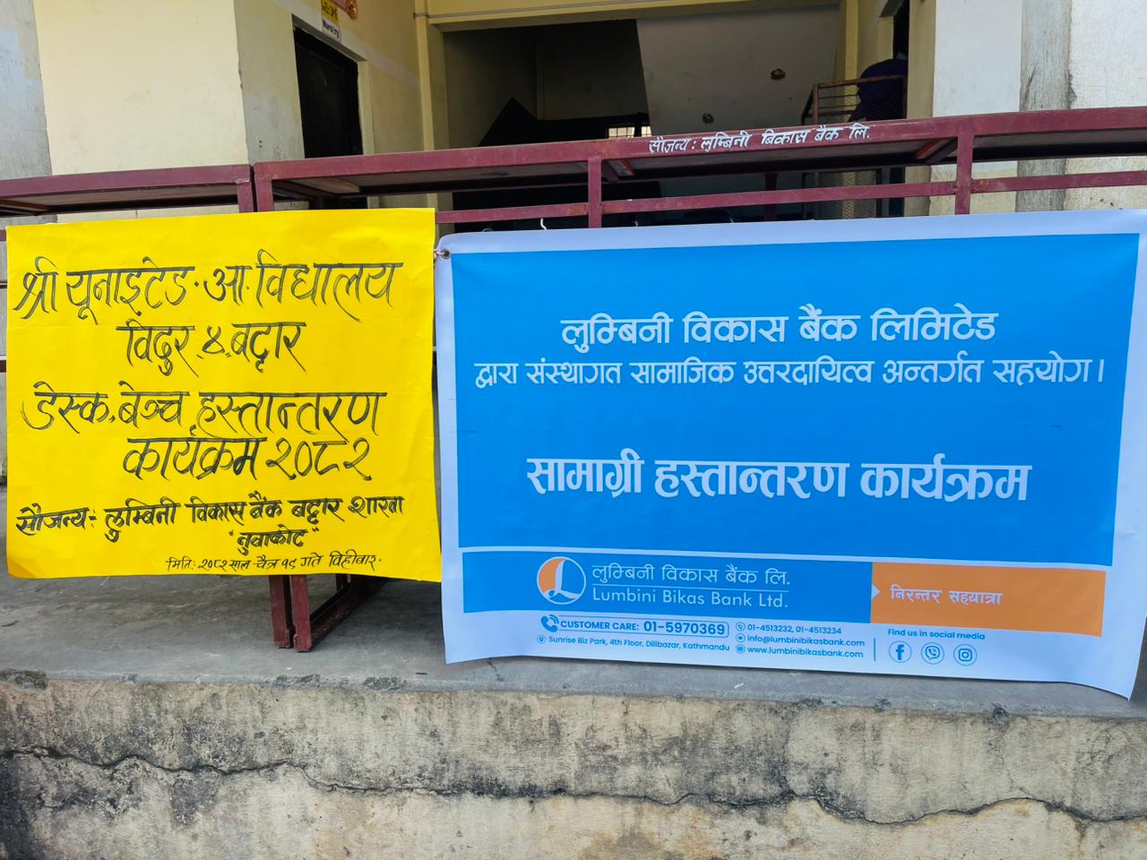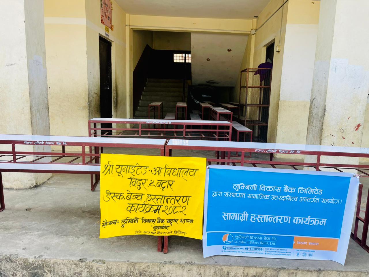 विदुर नगरपालिका ४ बट्टारस्थित युनाइटेड आधारभुत विद्यालयलाई बट्टारमै रहेको लुम्बिनी विकास बैंक बट्टार शाखाले विहीवार सामाजिक उत्तरदायत्वको भावनाले डेक्स बेन्चलगायतका शैक्षिक सामग्रीहरु सहयोग स्वरुप हस्तान्तरण गरेको हो । वैंकले विद्यालयलाई १० सेट डेक्स बेन्च हस्तान्तरण गरेको लुम्बिनी विकास बैंक बट्टार शाखा प्रमुख अजय आचार्यले जानकारी दिए ।
