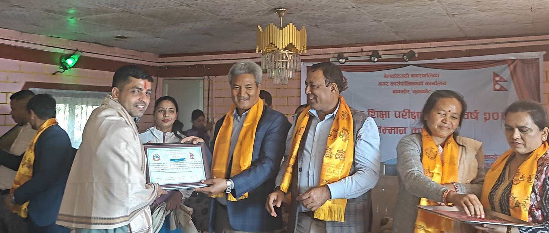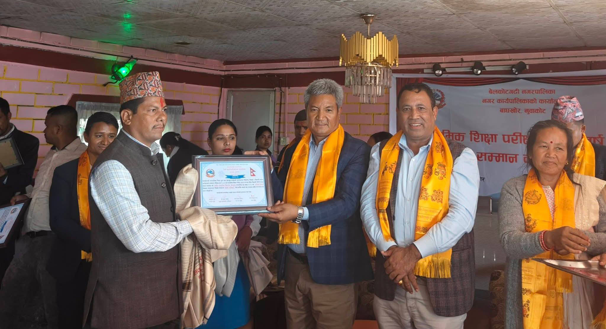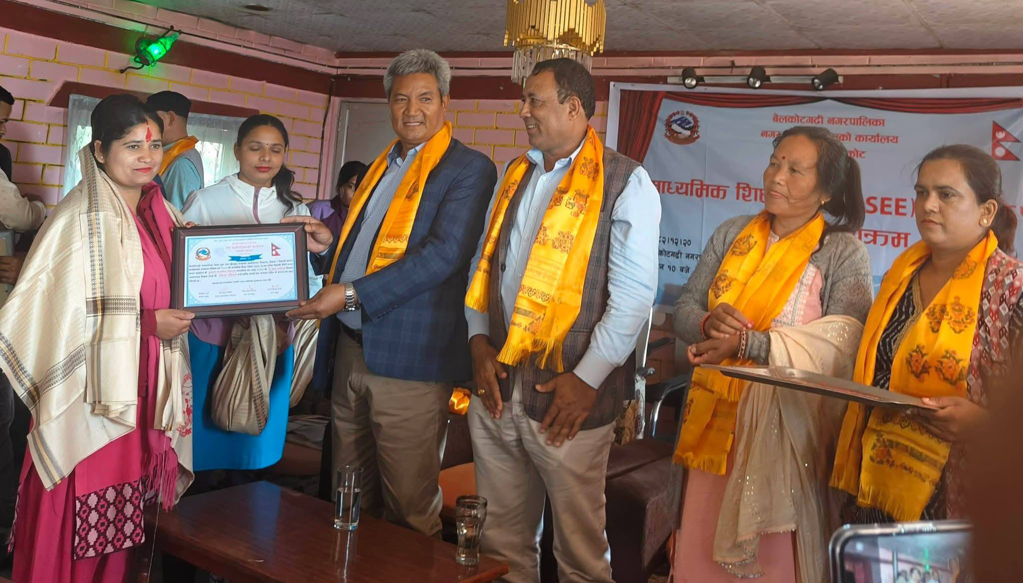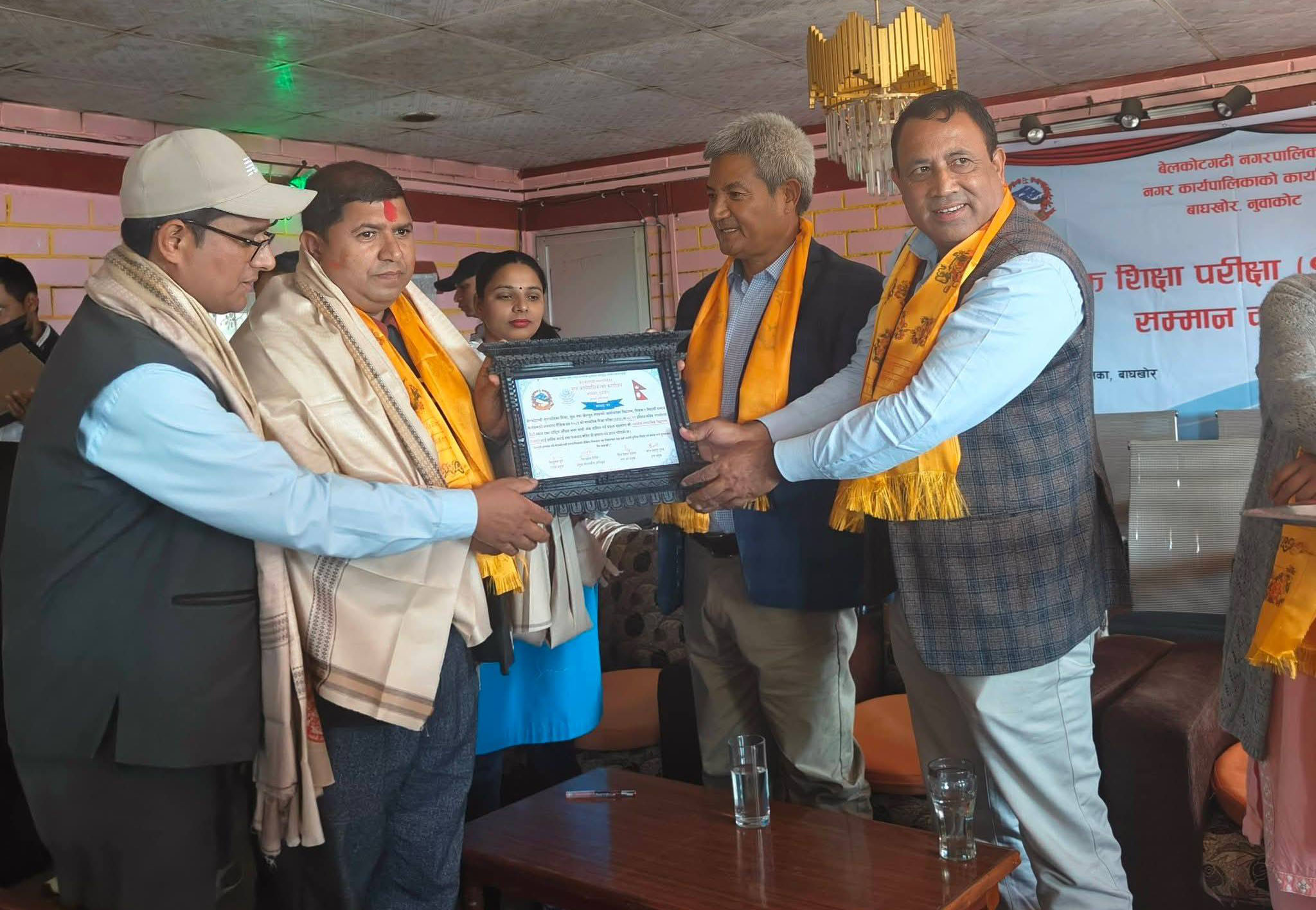 बिदुरः नुवाकोटको पुर्वी भेगमा रहेको बेलकोटगढी नगरपालिकाले एसइई परिक्षामा उत्कृष्ट नतिजा ल्याउने विद्यालय, शिक्षक तथा विद्यार्थीहरूलाई पुरस्कारसहित सम्मान गरेको छ । उत्कृष्ट नतिजा ल्याएका विद्यालयलाई शैक्षिक उपकरणसमेत प्रदान गरिएको छ । बेलकोटगढी नपाको कार्यालय बाघाखोरमा शुक्रबार आयोजित कार्यक्रमकाबीच एसइई परीक्षा २०८१ मा उत्कृष्ट नतिजा ल्याएका ९ वटा विद्यालयबाट शतप्रतिशत नतिजा ल्याउन सफल ६० जना विषयगत शिक्षकलाई विशेष सम्मान गरिएको छ ।