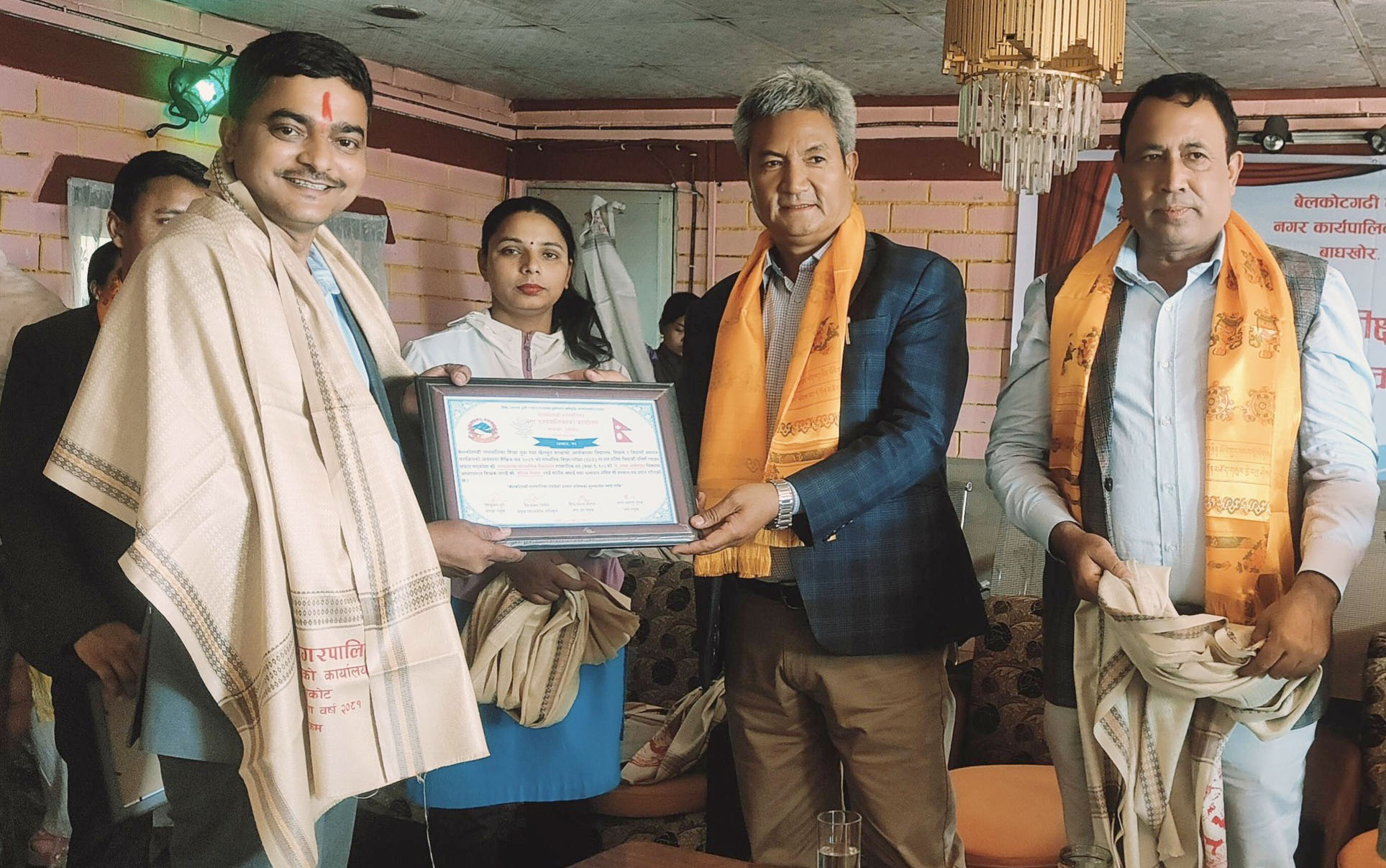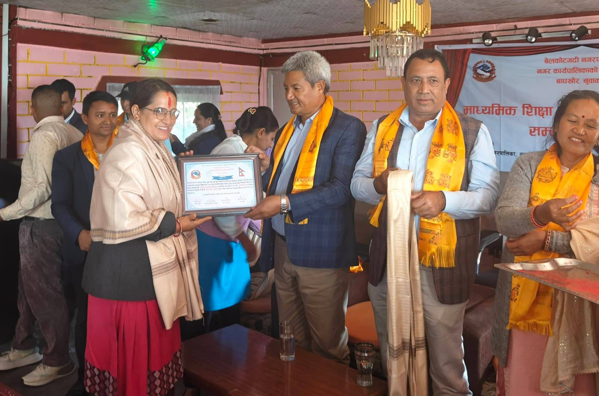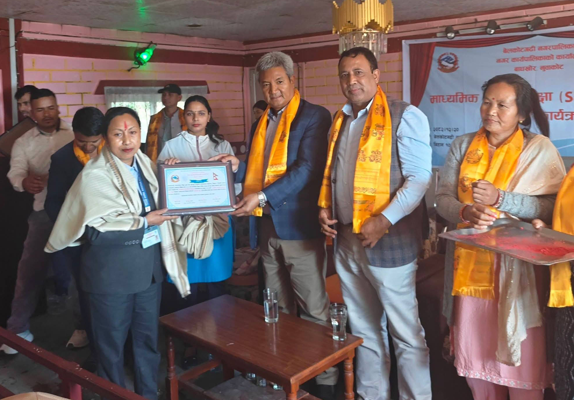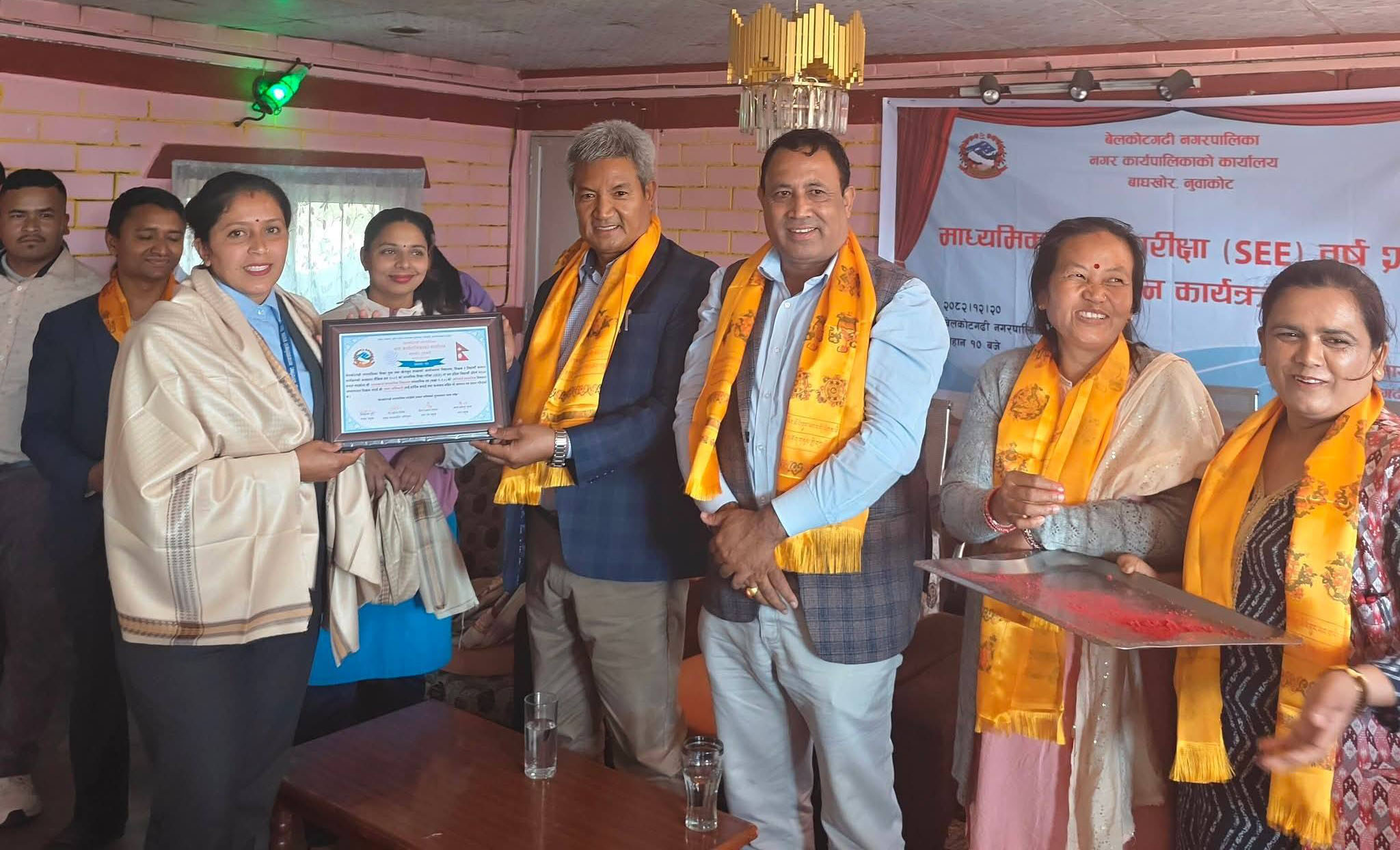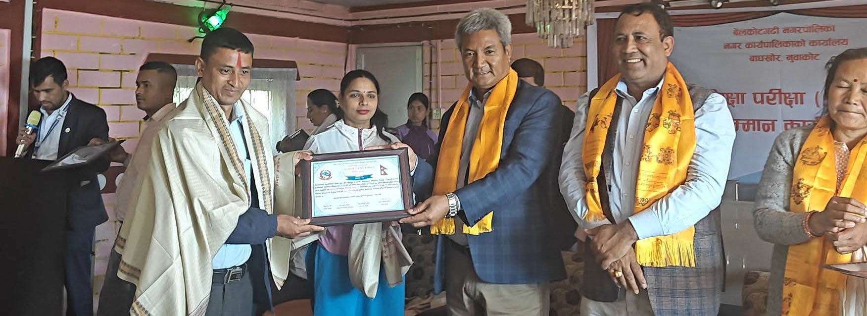 बिदुरः नुवाकोटको पुर्वी भेगमा रहेको बेलकोटगढी नगरपालिकाले एसइई परिक्षामा उत्कृष्ट नतिजा ल्याउने विद्यालय, शिक्षक तथा विद्यार्थीहरूलाई पुरस्कारसहित सम्मान गरेको छ । उत्कृष्ट नतिजा ल्याएका विद्यालयलाई शैक्षिक उपकरणसमेत प्रदान गरिएको छ । बेलकोटगढी नपाको कार्यालय बाघाखोरमा शुक्रबार आयोजित कार्यक्रमकाबीच एसइई परीक्षा २०८१ मा उत्कृष्ट नतिजा ल्याएका ९ वटा विद्यालयबाट शतप्रतिशत नतिजा ल्याउन सफल ६० जना विषयगत शिक्षकलाई विशेष सम्मान गरिएको छ ।