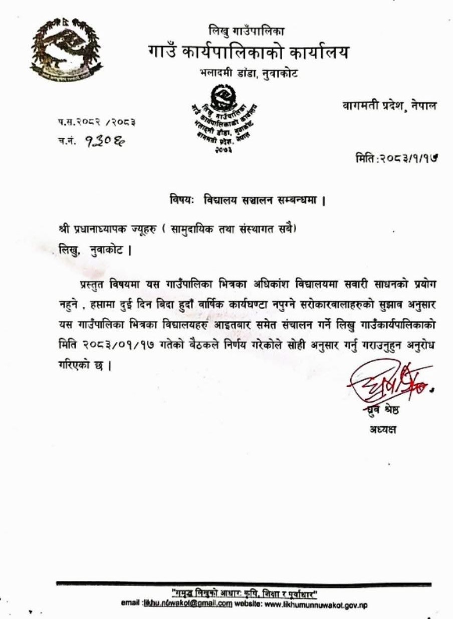 बिदुरः नुवाकोटको पुर्वी भेगमा रहेको लिखु गाउँपालिकाले आइतबार विद्यालय सञ्चालन गर्ने निर्णय गरेको छ । गाउंपालिका अध्यक्ष ध्रुव श्रेष्ठले विहीवार सम्पुर्ण विद्यालयलाई उक्त निर्देशन दिएका हुन् । साप्ताहिक बिदा व्यवस्थापन तथा शैक्षिक क्यालेन्डरअनुसार गाउँपालिकाभित्रका विद्यालयहरू आइतबारदेखि नियमित सञ्चालन हुने भएका हुन् ।