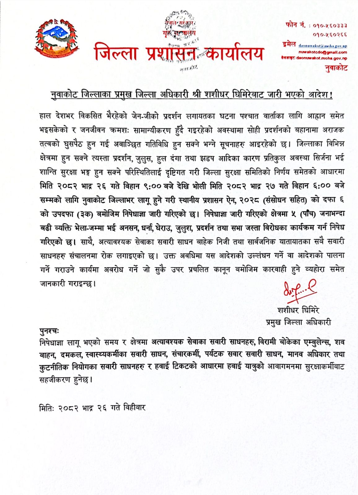 निषेधाज्ञा शुक्रवार विहानसम्म थप
